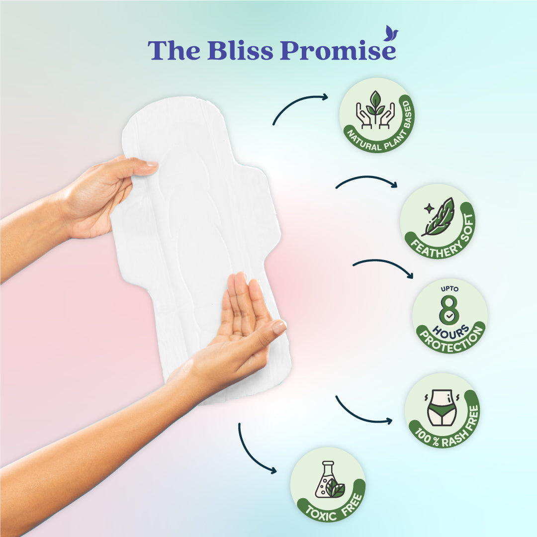 The Bliss Natural Sanitary Combo Pack is free from rashes and itching. It prevents discomfort and provides soft and soothing protection all day.