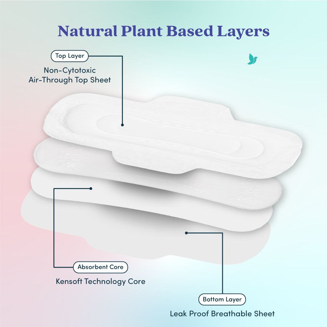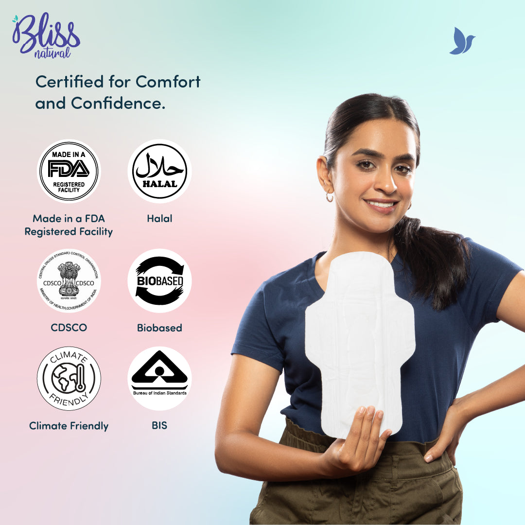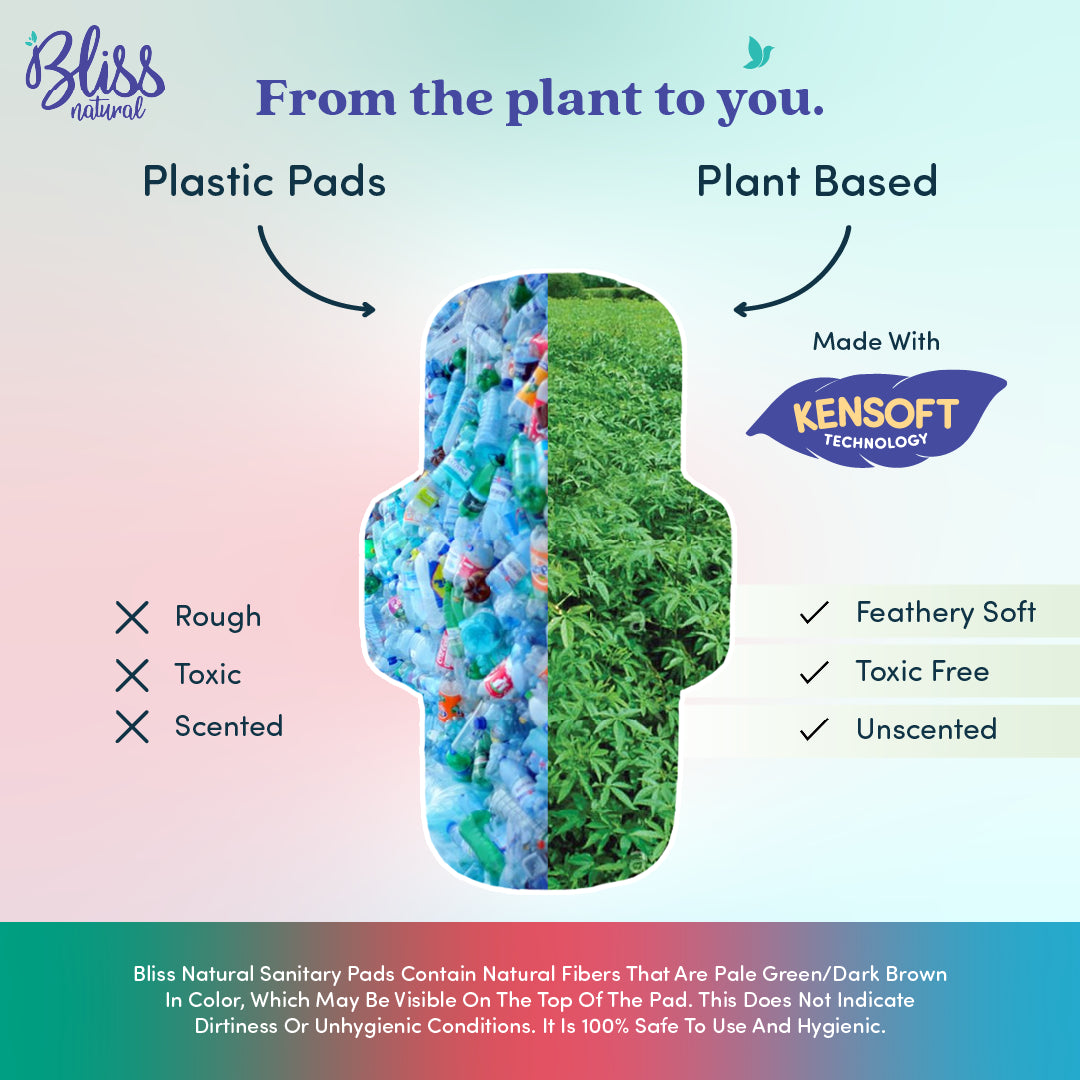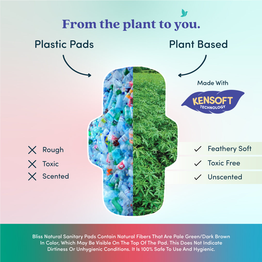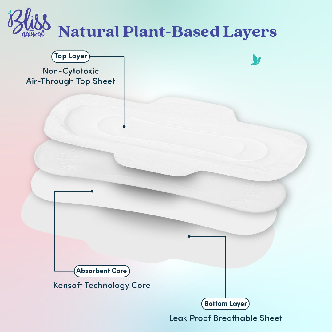 Bliss Natural Sanitary Combo Pack is biobased certified, made with Kensoft Technology, and uses plant-based fibers. Our plant-based properties ensure a natural feel, good absorbency, and non-irritation for women.