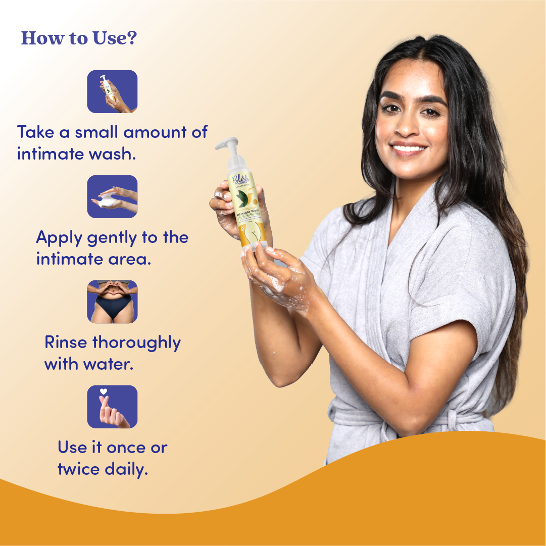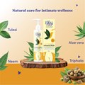 Bliss Natural Plant-Based Intimate Wash, enriched with Triphala, Neem, Tulasi, and Aloe Vera, is designed for daily use. It gently cleanses, maintains natural pH, reduces pigmentation, controls odour, soothes itching, and keeps skin hydrated, leaving your intimate area fresh, balanced, and irritation-free all day.
