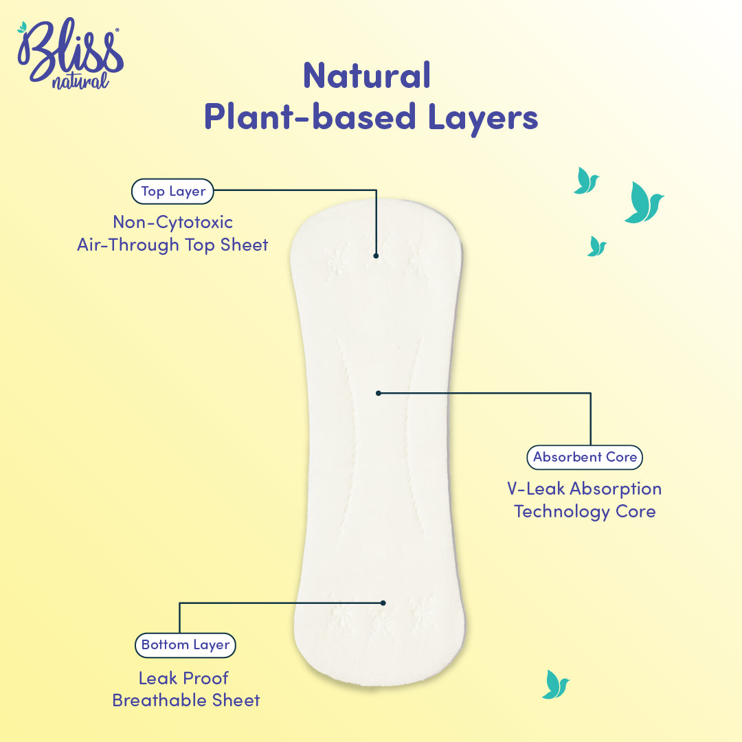 Bliss Natural plant-based panty liners protect against white discharge and all other types of vaginal leakages or spotting, making them a reliable choice for everyday feminine hygiene. They help you feel fresh, clean, and confident throughout the day.