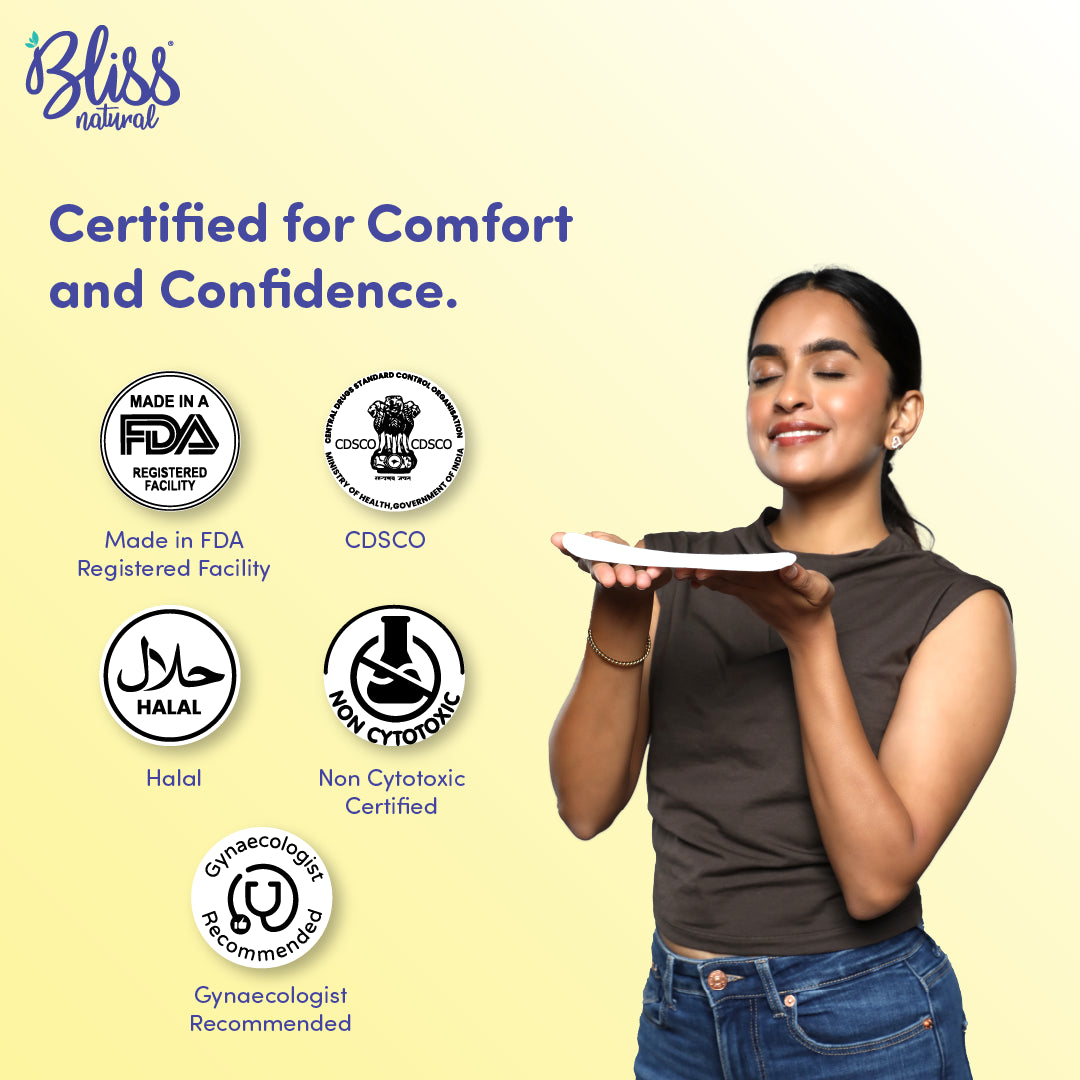 Bliss Natural Panty Liners are non-cytotoxic certified and recommended by a gynecologist. They ensure a safe, irritation-free experience with the highest standards of hygiene and comfort.