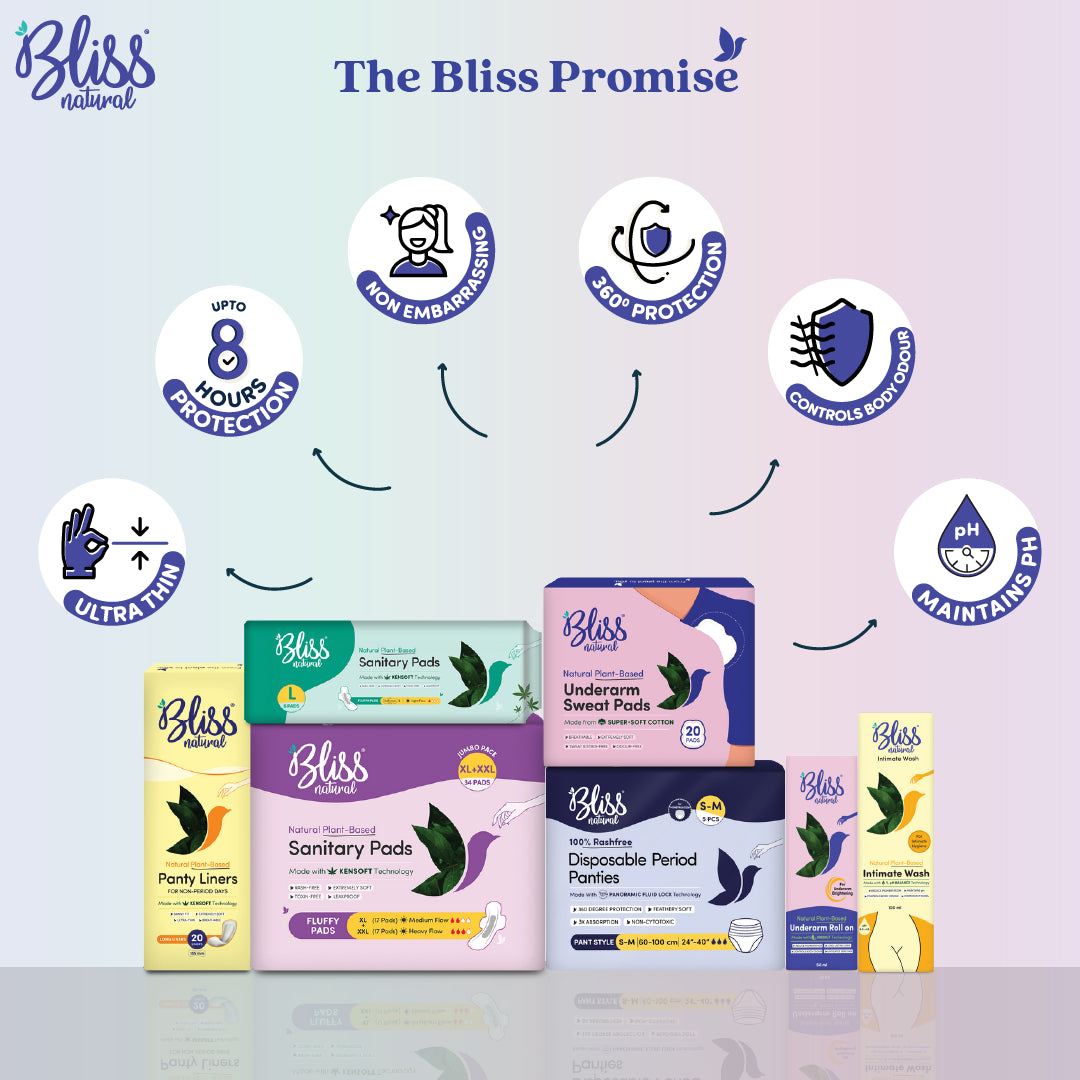 Jumbo Pack XL and XXL Size Sanitary Pads provide superior coverage and confidence on your medium-to-heavy flow days. Made with plant-based, non-toxic materials, bliss pads offer leak-proof protection, comfort without rashes, and freshness that lasts for a safe, worry-free period care.